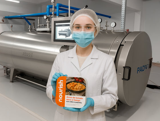 Utilizamos o processo de autoclave para esterilizar e selar nossas marmitas, garantindo uma conservação segura por até 24 meses, sem a necessidade de refrigeração. Essa tecnologia é o coração da Nourish...